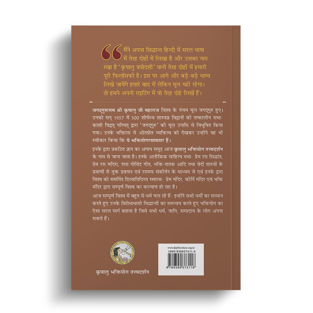 This incredibly succinct 13-verse summary of his entire doctrine, written in accordance with Vedic scriptures, is the creation of Jagadguruttam Shri Kripalu Ji Maharaj. The helpful inclusion of his commentary on these verses, sourced from various discourses he gave, gives tremendous insight into their depth and the brilliance of their creator. Immensely beneficial for seekers of God’s love at any stage along the path to His realisation, these unifying principles of Shri Kripalu Ji's philosophy have never been more accessible.